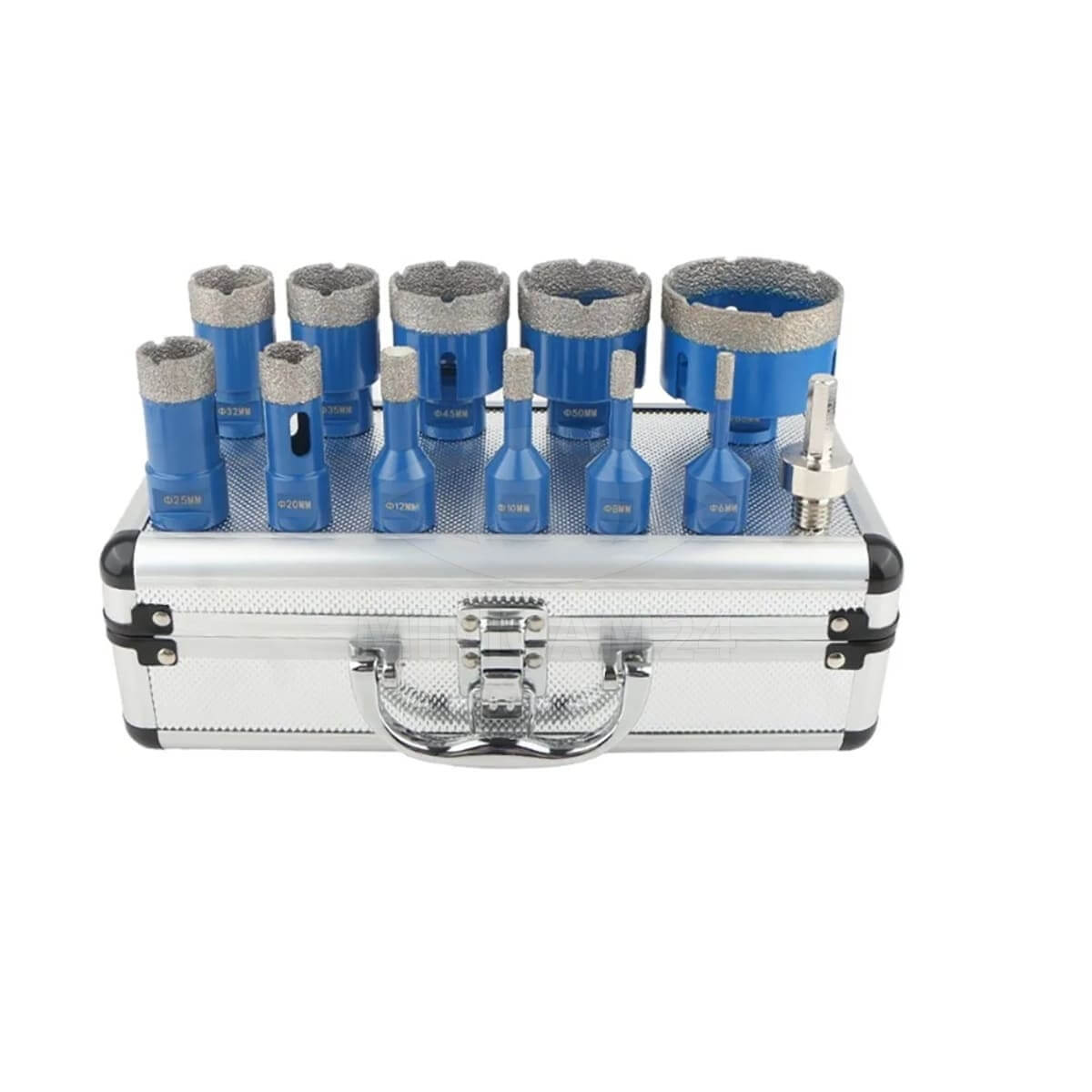 Переходник с шестигранной головкой 3/8 на M14 обеспечивает совместимость с большинством угловых шлифмашин (УШМ). Все коронки упакованы в прочную алюминиевую коробку, которая обеспечивает надежное хранение и защиту инструмента. Этот набор станет незаменимым помощником для профессионалов и любителей, обеспечивая высокое качество реза и долговечность в эксплуатации.
